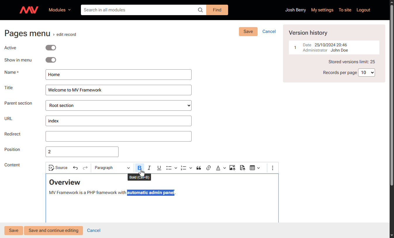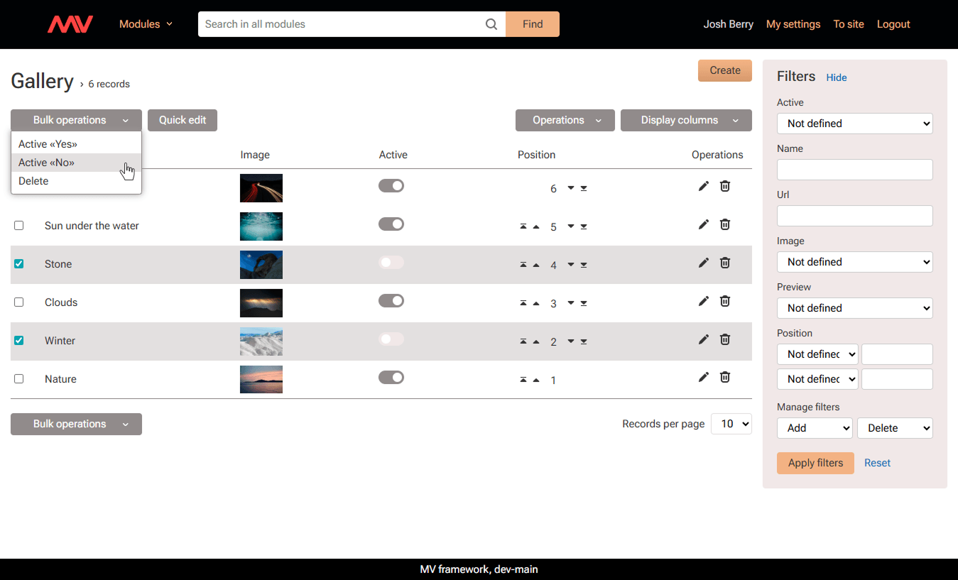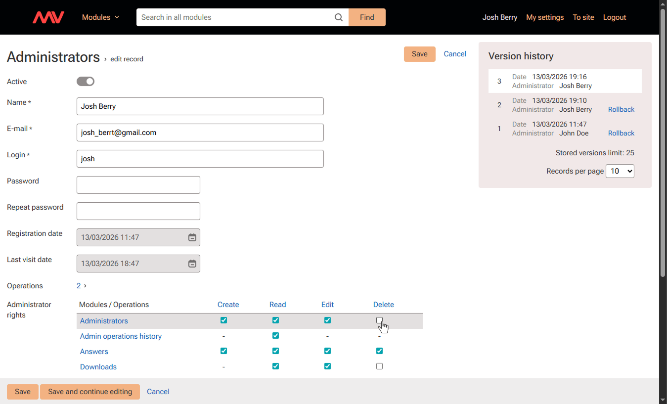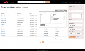 All module records are listed in a main table, with a filter column on the right for searching specific records. Table fields and their order can be customized, and filters can be hidden. Batch operations for editing and deletion are available for records, and each record's changes are logged, allowing a return to previous versions.