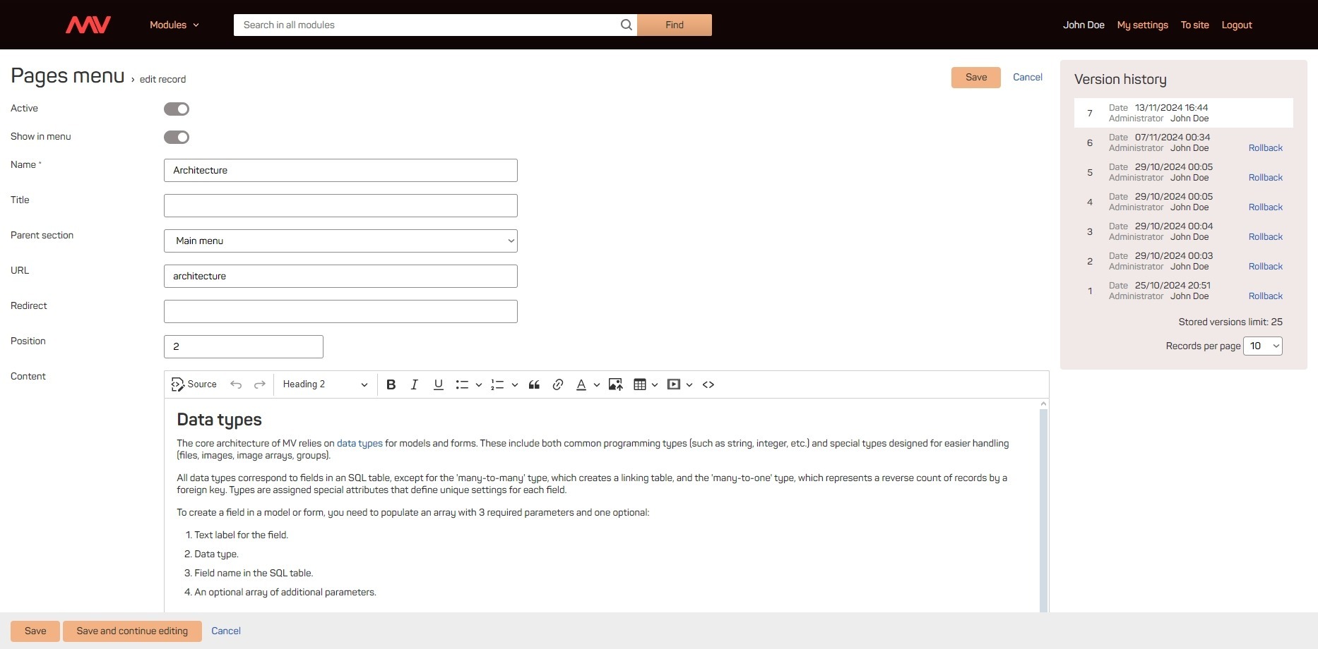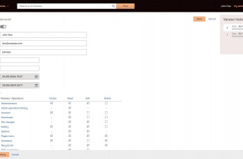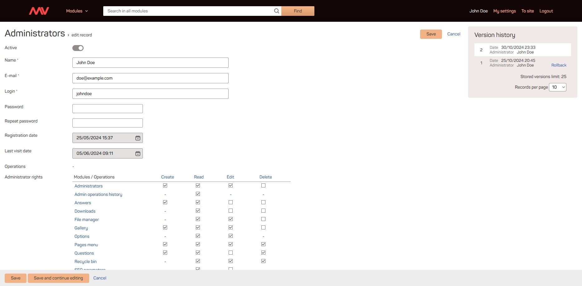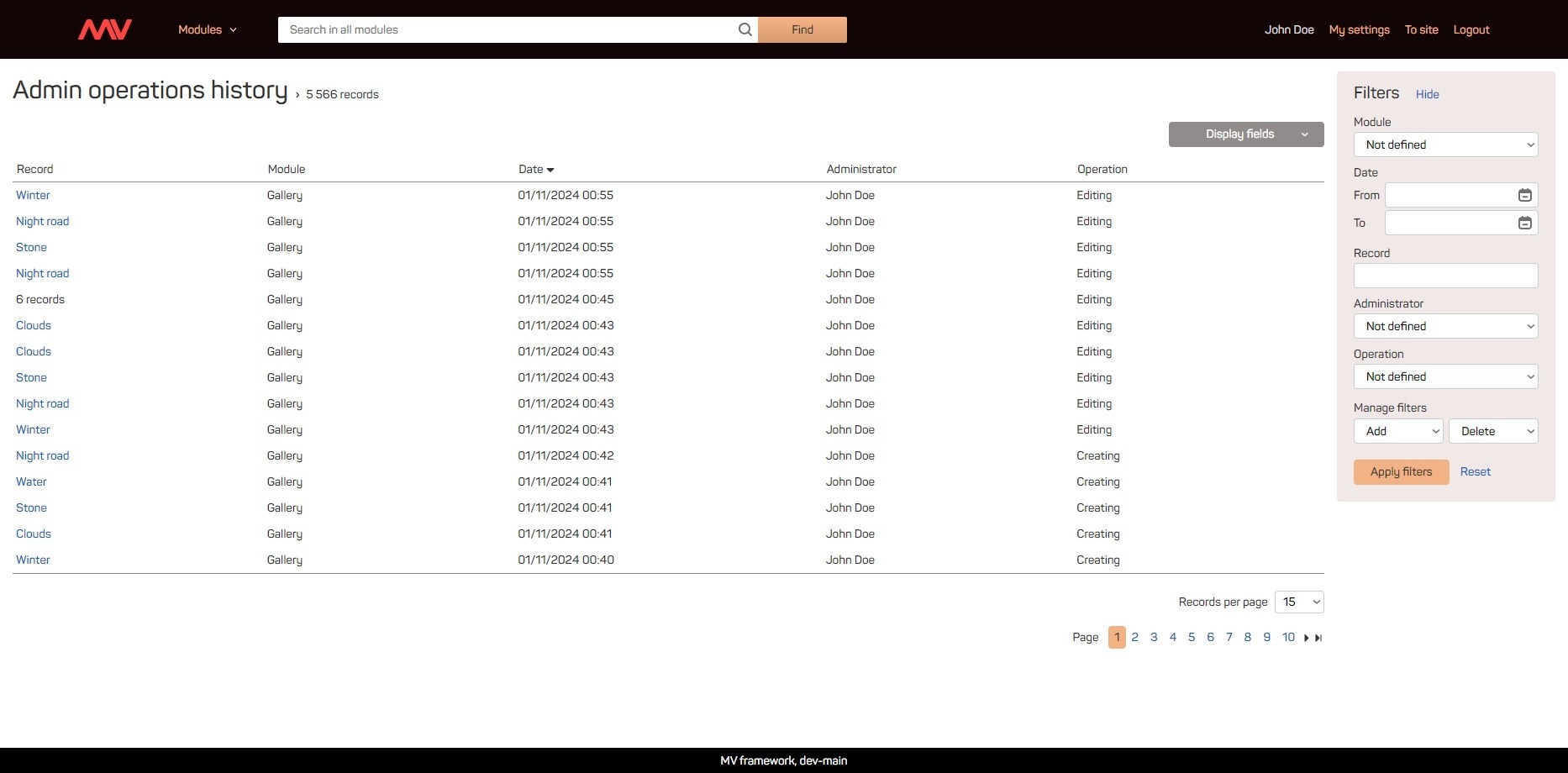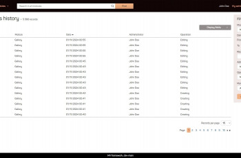 All module records are listed in a main table, with a filter column on the right for searching specific records. Table fields and their order can be customized, and filters can be hidden. Batch operations for editing and deletion are available for records, and each record's changes are logged, allowing a return to previous versions.