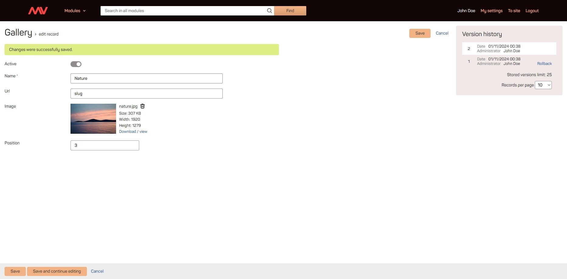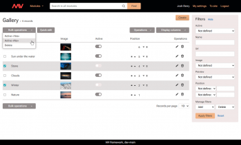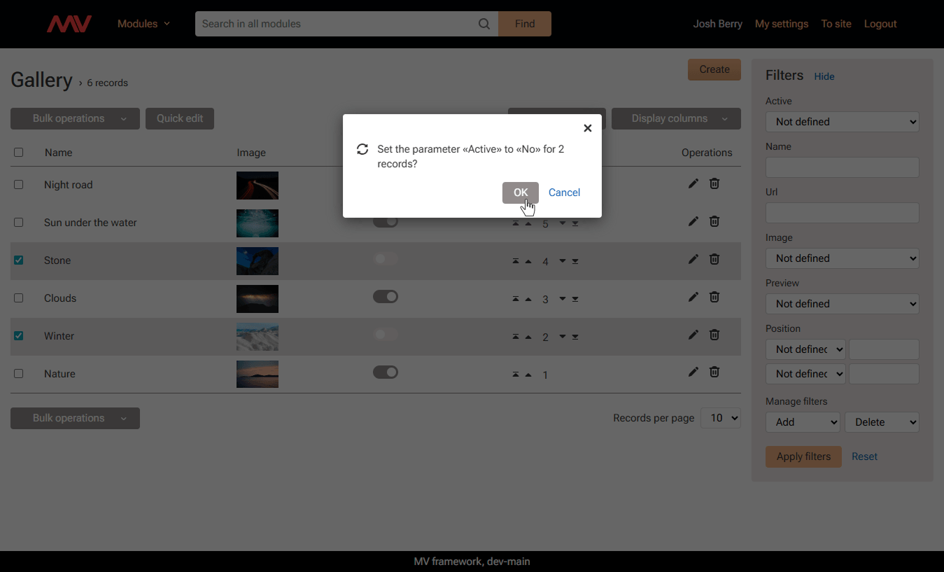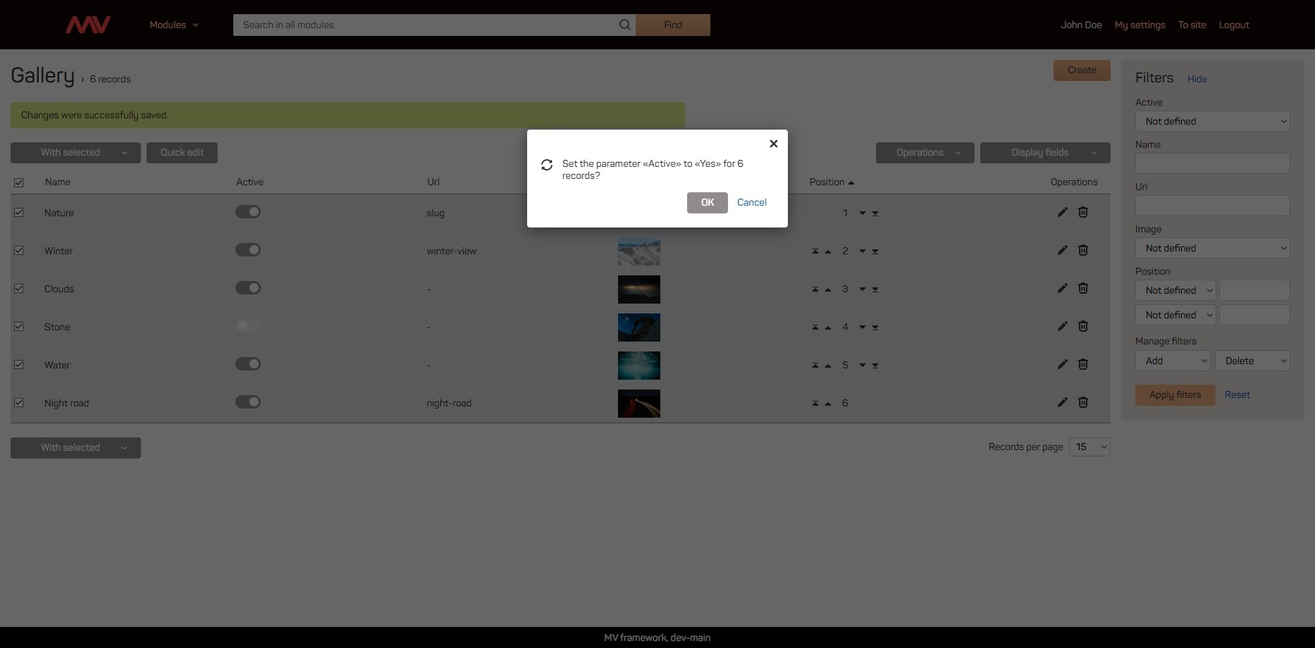 All module records are listed in a main table, with a filter column on the right for searching specific records. Table fields and their order can be customized, and filters can be hidden. Batch operations for editing and deletion are available for records, and each record's changes are logged, allowing a return to previous versions.