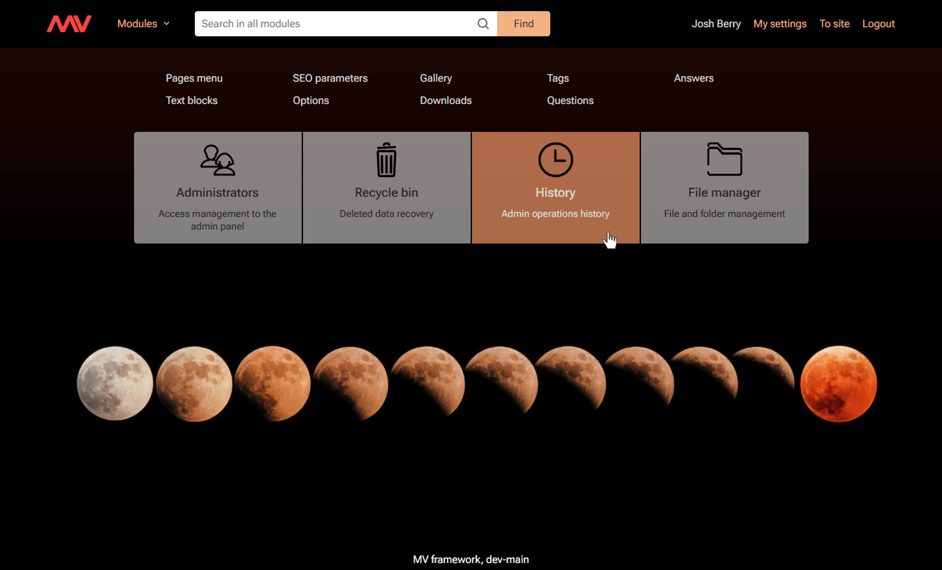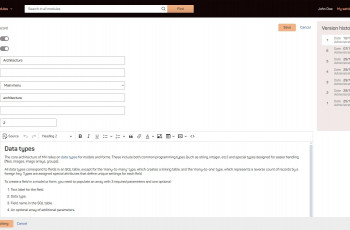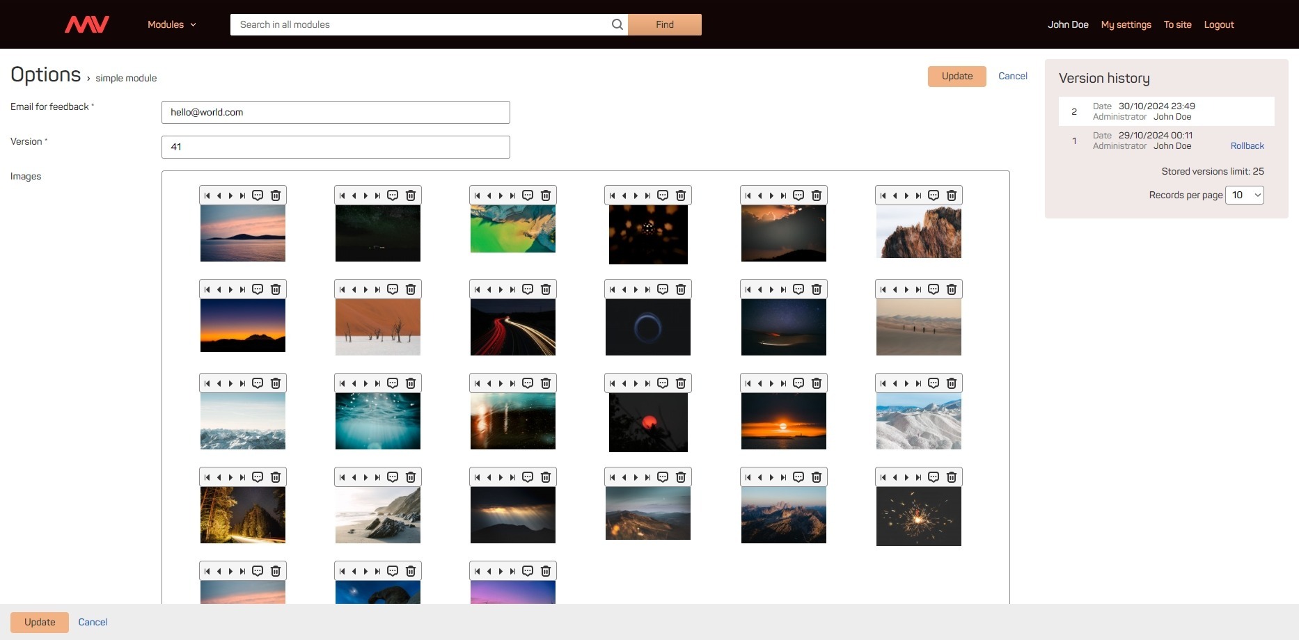 For data represented as a single entity, simple modules are created. These modules do not have a main list but still maintain a change history for all fields.